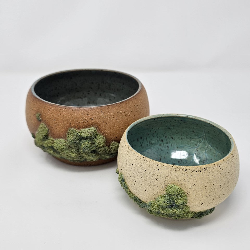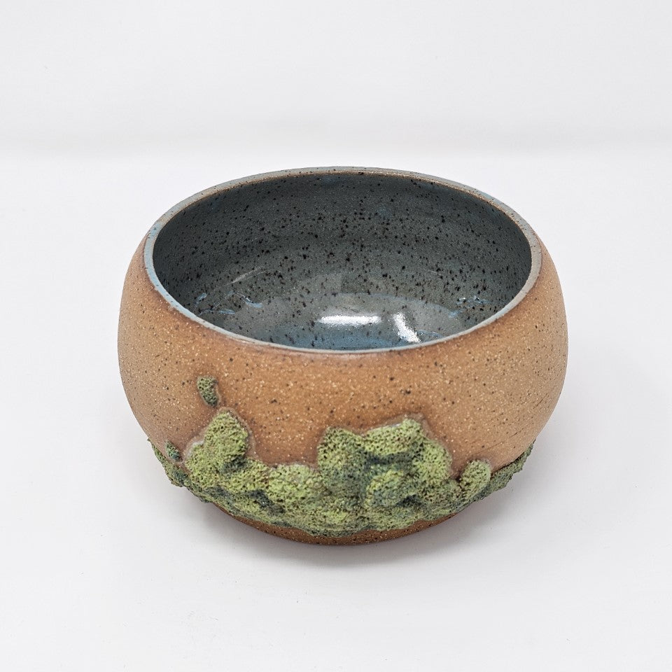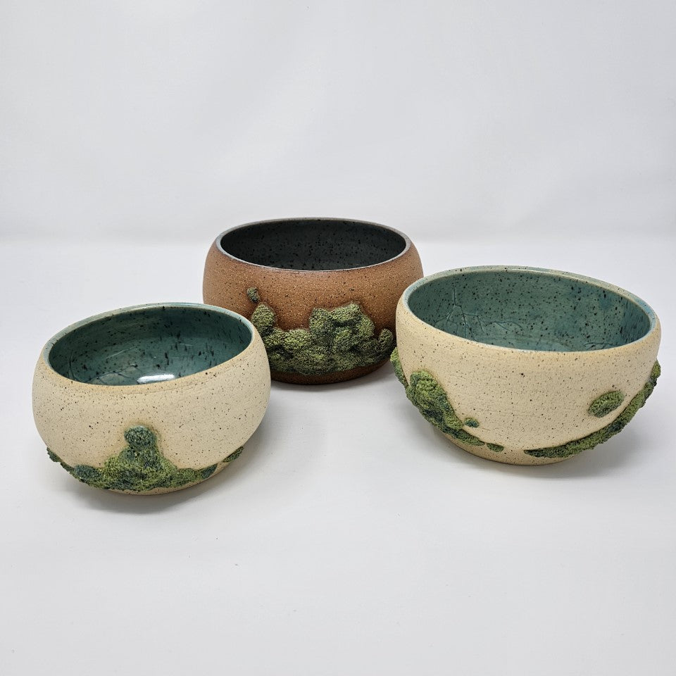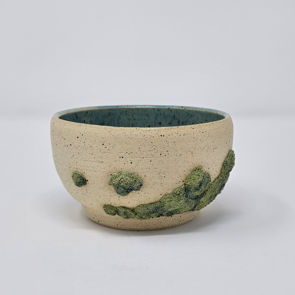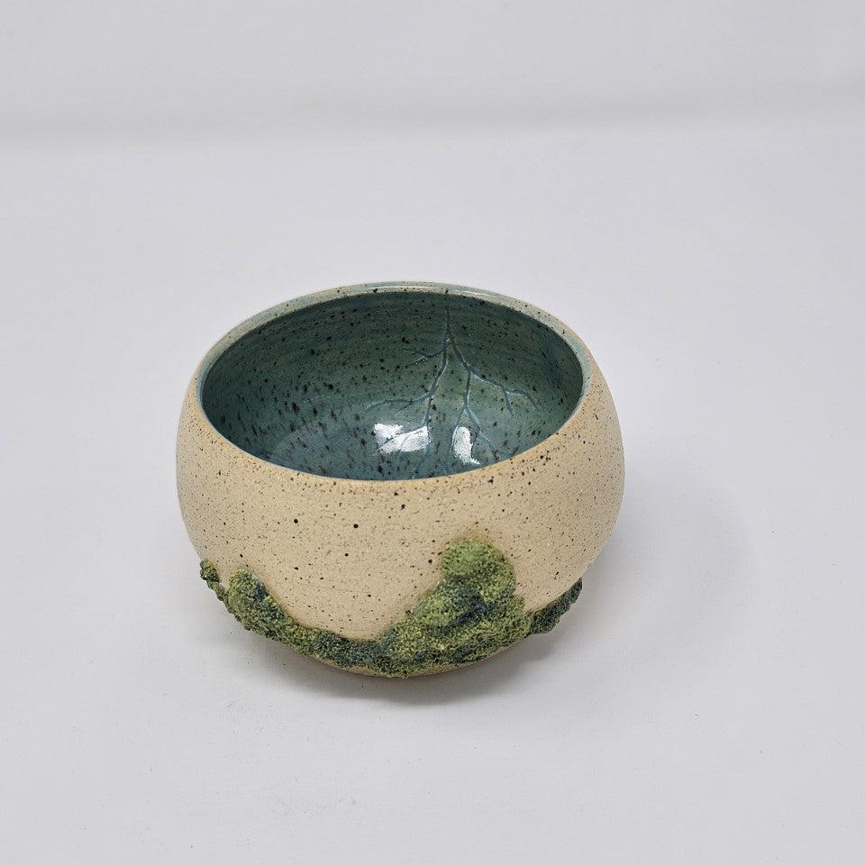 These bowls are part of a collection exploring nature’s response to pollution. They represent phosphorus runoff into ponds, which causes rapid algae growth. Planting mushrooms around these ponds helps by absorbing phosphorus through their fine mycelium roots, which then redistribute it to nearby vegetation. The outside of the bowls depicts algae growth, while the inside is blue to represent water, with carved mycelium roots symbolizing the mushroom root system.